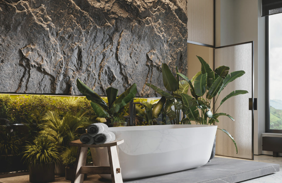 кварцевый агломерат в биофильном интерьере ванной